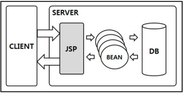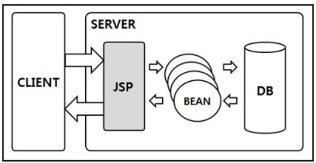 모델1 방식은 데이터베이스 연동 같은 비즈니스 로직 작업과 그작업 결과를 나태내주는 작업을 동일한 JSP에서 수행합니다. 즉, 모든 클라이언트의 요청과 비즈니스 로직 처리를 JSP가 담당하는 구조입니다.
