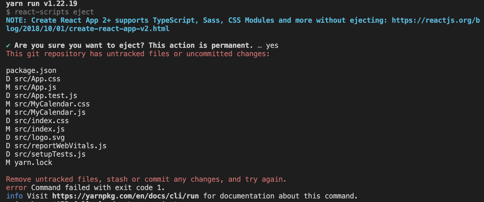 서론 오늘은 Fullcalendar 학습 중 WebPack 설치 에러 때문에 작성해 보고자 한다. WebPack 설치 yarn add eject 다만 본인은 처음에 아래처럼 에러가 발생했다. ❗ 문제 발생 문제를 확인 하니 처음 접하다보니 습관성 구글선생님을 찾게 되었고 해당 문제는 현재 변경 사항을 저장하지 않은 상태로 WebPack을 설치하면 이러한 에러가 뜬다고 한다. ✅ 문제 해결 이렇게 완료 시 화면이 뜬다. 공유하기 게시글 관리 U Flix